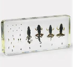 Содержит образцы лягушки на разных стадиях развития в натуральную величину, помещенные в прозрачный акрил. Включает этапы развития: икру, личинку, головастика на разных стадиях (с хвостом, с лапками и хвостом, с лапками с исчезающим хвостом, без хвоста) и сформировавшуюся взрослую лягушку.