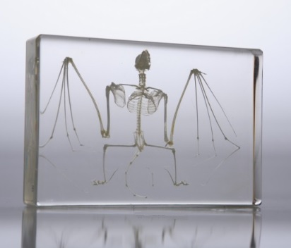 Пособие представляет собой законсервированный в пластмассовом прозрачном блоке скелет летучей мыши, отдельные кости которого обозначены цифровыми метками.