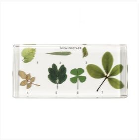Пособие предназначено для изучения разнообразия растений и их типов. В коллекции представлены простые и сложные типы листьев. Имеется вкладыш со списком образцов.