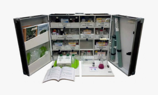 Портативная специализированная химико-экологическая лаборатория (ШХЭЛ) представляет собой совокупность изделий и модулей, каждый из которых включает специально подобранные готовые к применению реагенты, тест-системы, портативные средства дозировки проб, мерную пластмассовую и стеклянную посуду и др., размещённые в укладке для учителя и в наборах для учащихся.